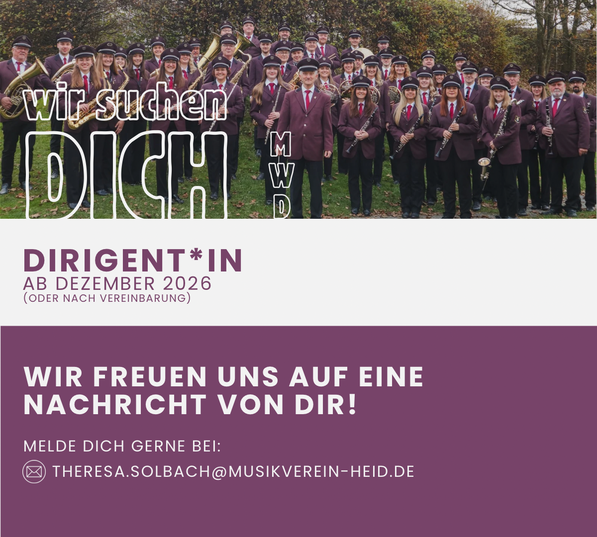 Wir suchen ab Dezember 2026 (oder nach Vereinbarung) eine engagierte Dirigentin oder einen engagierten Dirigenten, die / der gemeinsam mit uns musikalisch und menschlich neue Wege geht. WIR SUCHEN DICH!